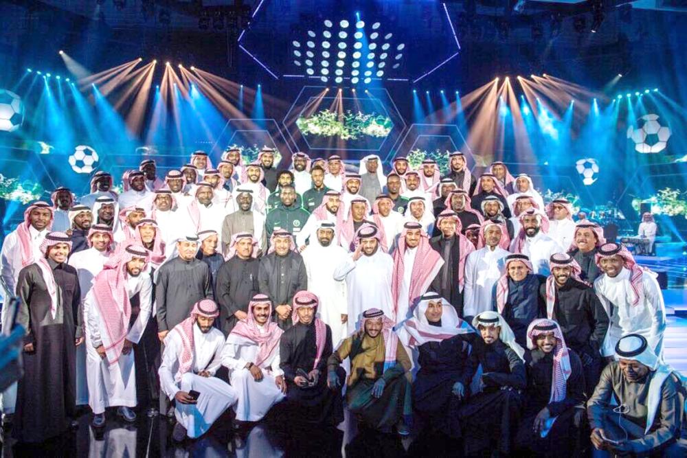 رئيس هيئة الرياض تركي آل الشيخ مع لاعبي المنتخب السعودي خلال الاحتفالية. (عكاظ)
