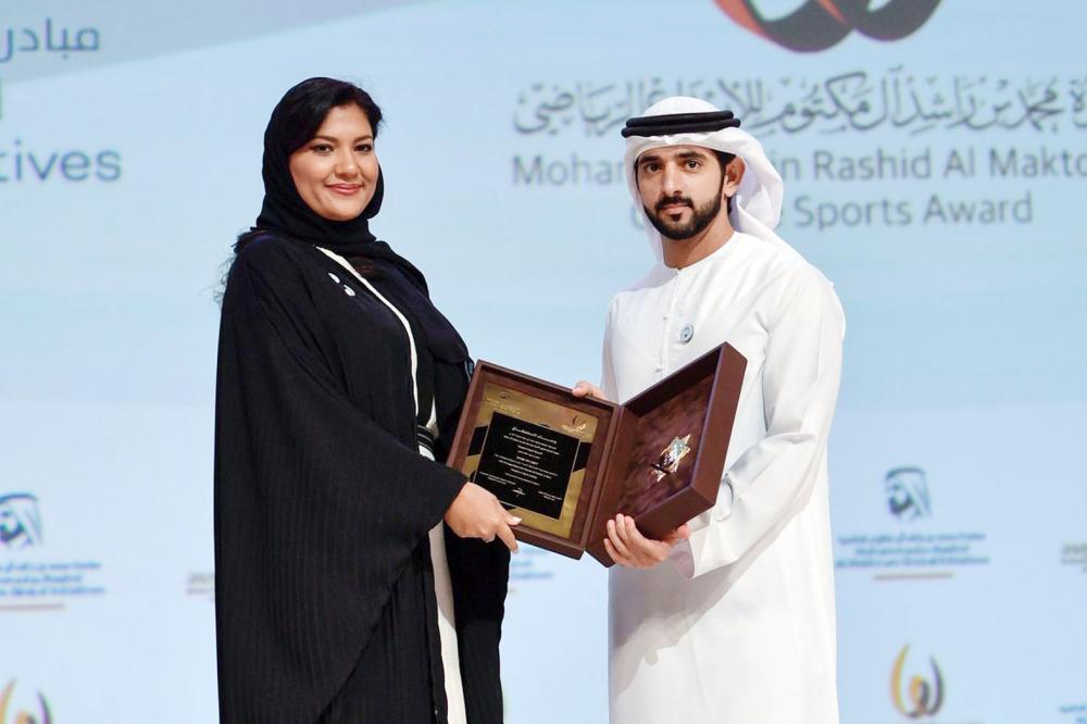 كرم ولي عهد دبي رئيس مجلس دبي الرياضي الشيخ حمدان بن محمد بن راشد آل مكتوم، وكيل الهيئة العامة للرياضة للتخطيط والتطوير رئيس الاتحاد السعودي للرياضة المجتمعية الأميرة ريما بنت بندر بن سلطان آل سعود، في فئة الشخصية الرياضية العربية، كأحد الفائزين في الدورة التاسعة من «جائزة محمد بن راشد آل مكتوم للإبداع الرياضي»، أمس (الأربعاء) في دبي.