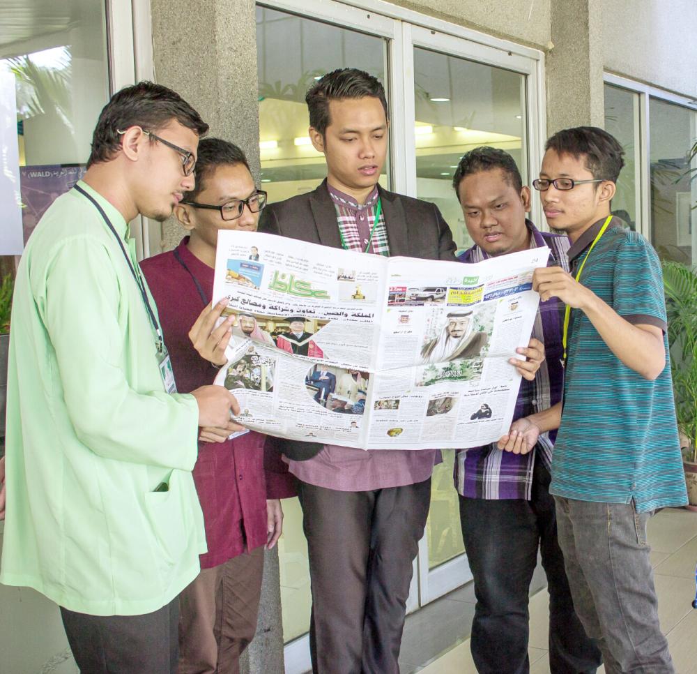 عزوان وطلابه بالجامعة الماليزية يطالعون «عكاظ».