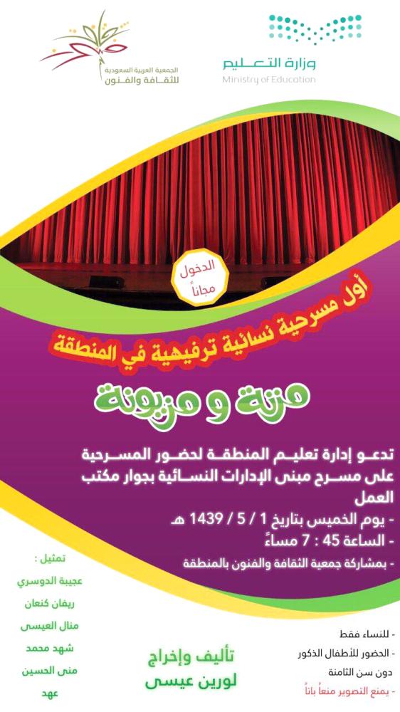 ما إن أعلنت جمعية الثقافة والفنون بعرعر، إقامة المسرحية النسائية «مزنة ومزيونة»، بتنظيم إدارة تعليم الحدود الشمالية، حتى انهالت دعوات مقاطعة المسرحية، للحيلولة دون عرضها، رغم أن طاقم العمل والحضور نسائي، والمنظِّمات نساء، إضافة إلى تشديد الجهات المنظمة على منع التصوير داخل المسرح. ولجأ بعض معارضي المسرحية النسائية إلى إنشاء وسم في «تويتر» للتحريض ضد إقامة الأمسية تحت شعار «تغريب المرأة» إلا أن دعوات المقاطعة فشلت فور بداية العرض المسرحي يوم (الخميس) الماضي، إذ امتلأت مقاعد المسرح بالكامل، وبحضور أكثر من 200 متفرجة. بينما أرجع محاولو المقاطعة ذلك، إلى تأكيد ناشطة تويتر المخرجة «بايو» ألا فرق بين الأديان والألوان والبلدان، وأن العالم كله وطنها. فيما أرجع البعض السبب إلى حرص المخرجة وفريق العمل على توثيق زياراتهم بصور تذكارية في عدد من المواقع.