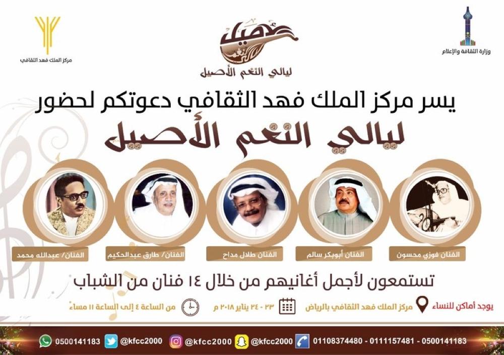 ضمن موسمه الثقافي 2018، يحتفي مركز الملك فهد الثقافي بكوكبة من رواد الأغنية السعودية في احتفالية ينظمها بعنوان «النغم الأصيل» يوم (الثلاثاء)، يكرم فيها عدد من الفنانين الذين تركوا بصمة في تاريخ الأغنية السعودية، على رأسهم صوت الأرض طلال مداح وطارق عبد الحكيم وفوزي محسون وعبد الله محمد وأبو بكر سالم بلفقيه رحمهم الله.