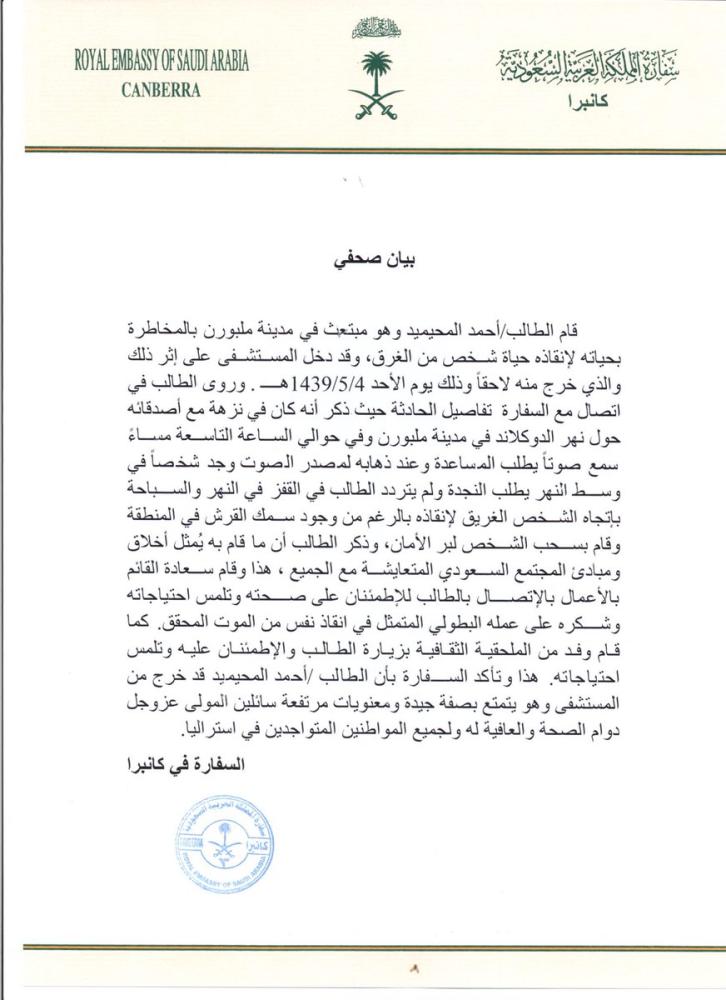 ولن ينسى المحيميد ذكرى الـ9 مساء من يوم الأحد الماضي، بعد أن رمى بنفسه في نهر الدوكلاند المسكون بأسماك قرش المياه العذبة، لإنقاذ رجل لا يعرفه، الأمر الذي يظهر شجاعة المبتعث السعودي المتحلي بالأخلاق الإسلامية والقيم السعودية، والأنموذج المشرف لمبتعثي البلاد في الخارج.