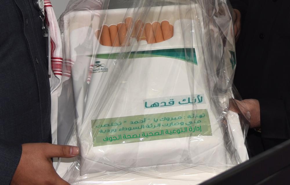 وأوضح مدير التوعية الصحية والإعلام الصحي بصحة الجوف تيسير بن عبدالرحمن العلي، أنه من خلال المبادرة، تقوم الإدارة بإهداء قالب كيك على هيئة "باكيت" سجائر، وهدية رمزية للزملاء الذين نجحوا في الإقلاع عن التدخينن، دُوِّن عليه تهنئة بهذا القرار، ونحثهم على قص قالب الكيك مع أطفالهم وإبلاغهم بأنهم قتلوا السجائر وتبدلت الرئة السوداء للوردية.