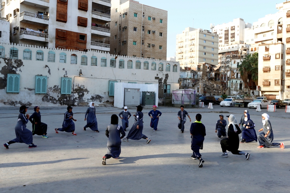 Women exercise during a running event marking International Women's Day in Old Jeddah, Saudi Arabia March 8, 2018. REUTERS/Faisal Al Nasser