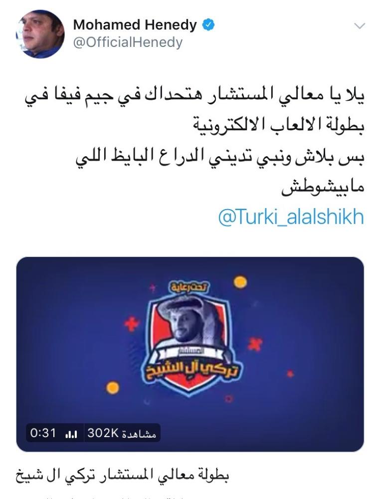 أعلن الممثل المصري محمد هنيدي عن تحديه رئيس الهيئة العامة للرياضة تركي آل الشيخ، اليوم (الأحد) في مسابقة المستشار تركي آل الشيخ للرياضات الإلكترونية، في مباراة إلكترونية في لعبة كرة القدم «فيفا».