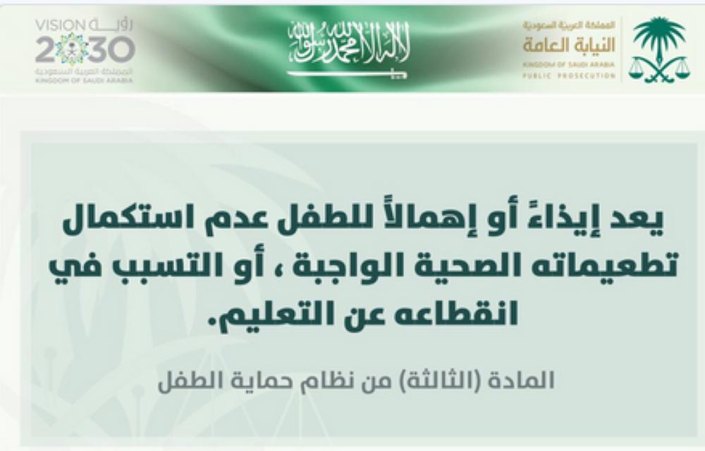 شددت النيابة العامة على ضرورة استكمال تطعيمات الطفل الصحية الواجبة، إضافة إلى مواصلة تعليمه. وفي تغريدة على حسابها في «تويتر» أوضحت أن عدم استكمال تطعيمات الطفل، أو التسبب في انقطاعه عن التعليم، من الحالات التي توجب المساءلة في ضوء أحكام نظام حماية الطفل. وكانت النيابة أكدت قبل أيام أن التقصير الواضح المتواصل في تربية الطفل ورعايته، يعتبر من الحالات التي توجب المساءلة، كما أكدت أن التقصير يعد إيذاءً أو إهمالاً للطفل، يوجب العقوبة، وفقاً للمادة الثالثة من النظام، فيما حذرت في وقت سابق من عرض المشاهد التي تشجع الطفل على التدخين، أو التدخين أثناء وجوده، مؤكدة أن ذلك من المحظورات التي توجب المساءلة القانونية.