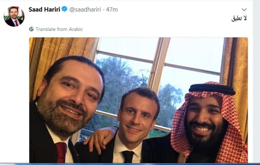 نشر رئيس الوزراء اللبناني سعد الحريري عبر حسابه الرسمي في «تويتر» اليوم (الثلاثاء)، صورة جديدة تجمعه مع ولي العهد الأمير محمد بن سلمان والرئيس الفرنسي إيمانويل ماكرون، وكتب في التغريدة تعقيباً على الصورة: «لا تعليق»، مكرراً التعقيب ذاته على الصورة التي بثها عبر حسابه أمس، وتجمعه مع الأمير محمد بن سلمان والعاهل المغربي الملك محمد السادس.