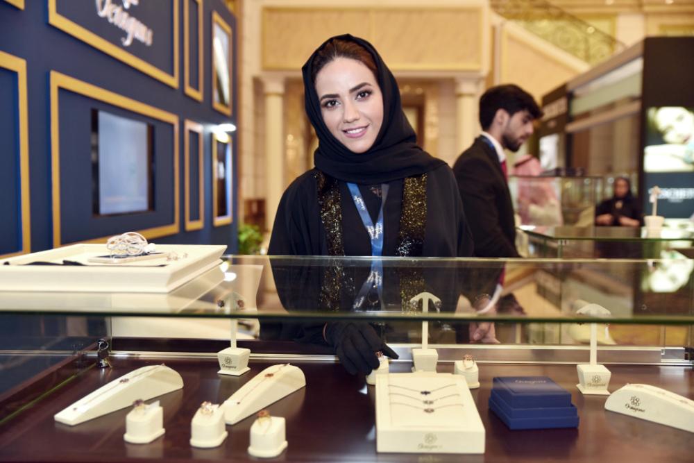 سيدة مشاركة في معرض صالون المجوهرات، تبرز بعض المعروضات النفيسة في اليوم الأول من الفعالية. (تصوير: أمل السريحي)