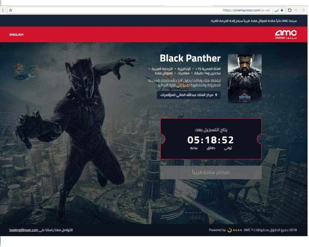 أعلنت «amc سينما» عن شراكتها الإستراتيجية مع «نون» (منصة التجارة الإلكترونية في المنطقة)، لبيع التذاكر الخاصة بالعرض الأول لفيلم «بلاك بانثر»، أحدث إنتاجات «مارفل ستوديوز» المقتبس عن القصة المصورة الشهيرة التي تحمل ذات الاسم، الذي سيكون عنوان عودة السينما رسمياً إلى المملكة، غدا (الجمعة)، وسيكون العرض الأول مخصصا للعائلات فقط، في حين سيتاح المجال للشباب في الفترة القادمة.