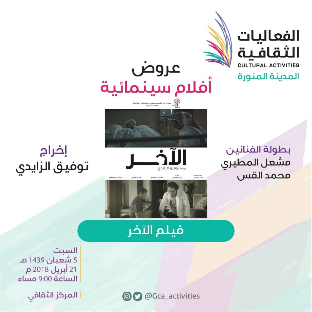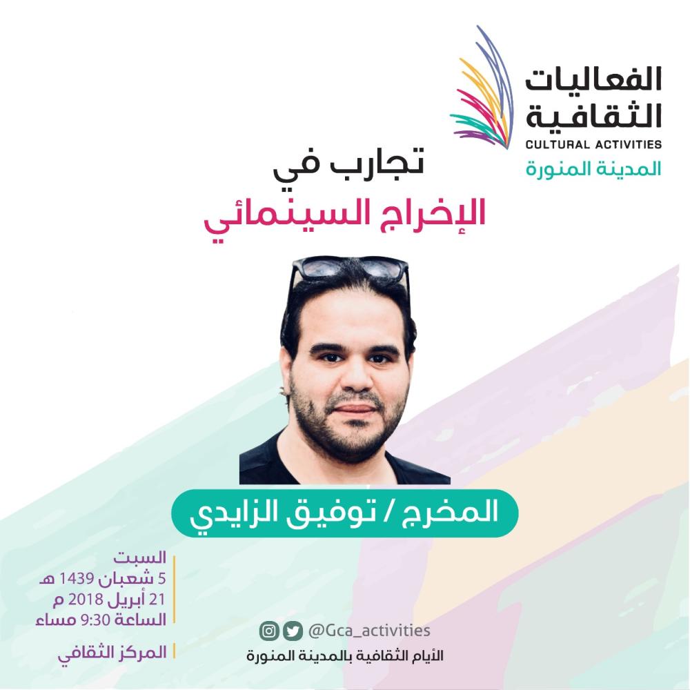 تستضيف الفعاليات الثقافية في المدينة المنورة اليوم المخرج السعودي توفيق الزايدي، ضمن برنامج تجارب في الإخراج السينمائي. ويتناول الزايدي تجربته السينمائية ومسيرته مع الجوائز. فيما سيتم عرض فيلم «الآخر»، الذي يعد آخر الأفلام التي أخرجها الزايدي، ونالت تقديرا في عدد من المهرجانات الخليجية والدولية.