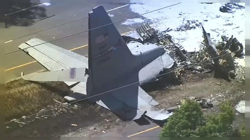 وتناثرت شظايا مشتعلة على طريق سريع وقضبان سكك حديدية نتيجة تحطم الطائرة وهي من طراز هيركيوليز دبليو.سي-130