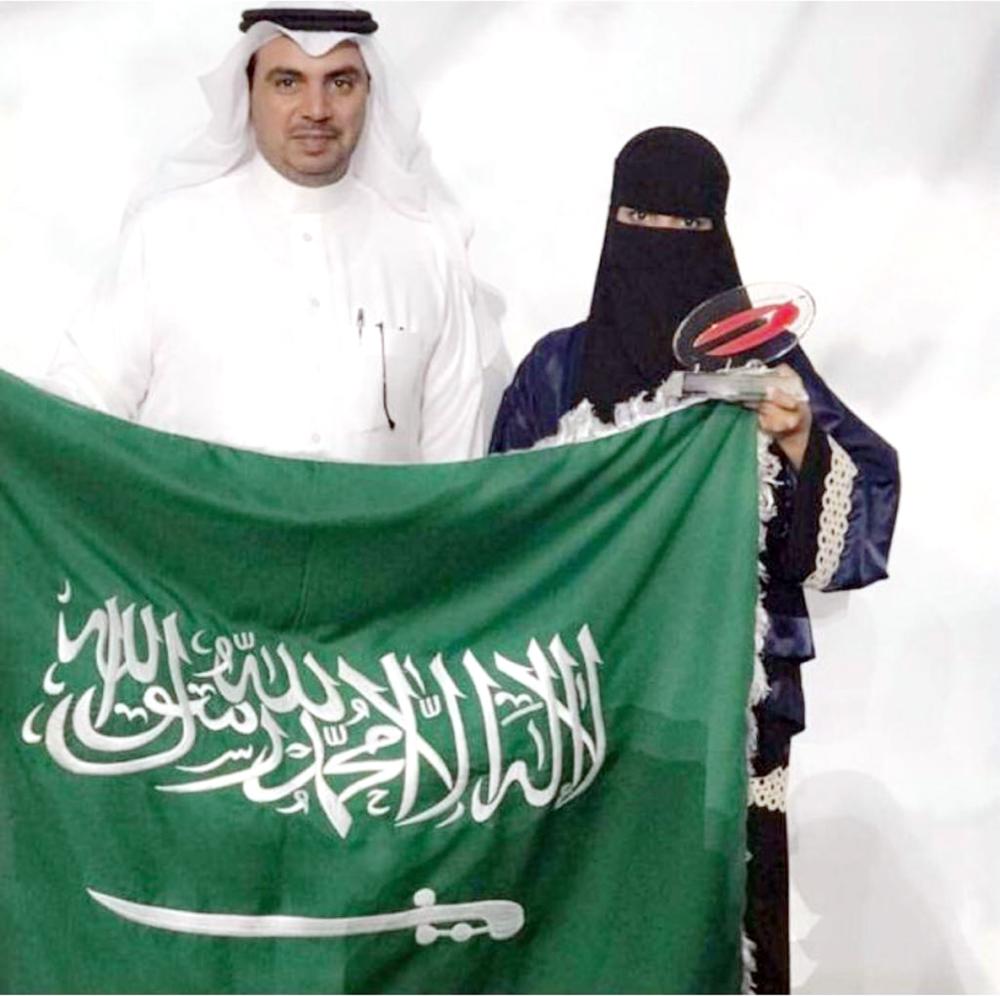 لجين القلطي مع والدها يحملان العلم السعودي وجائزة حمدان بن راشد للأداء العلمي التي فازت بها.