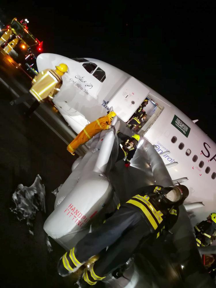 وأوضح المتحدث باسم الخطوط الجوية العربية السعودية المهندس عبدالرحمن الطيب، أنه في الساعة الثامنة من مساء أمس حدث خلل فني في نظام «الهيدروليك» لطائرة من طراز ايرباص (A330) رحلتها رقم 3818 المتجهة من المدينة المنورة إلى مطار دكا في بنغلاديش، فتقرر أن تعود إلى مطار الملك عبدالعزيز الدولي بجدة، وعند محاولة الهبوط تعذر إنزال العجلات الأمامية، وبعد عدة محاولات تقرر الهبوط بدون إنزال العجلات الأمامية وأخذ جميع الاحتياطات اللازمة، حتى هبطت بسلام وإنزال الركاب وعددهم 141 من الطائرة مع طاقم الطائرة المكون من 10 ملاحين، وأرجع الطيب نجاح عملية الهبوط إلى كفاءة قائد الطائرة وتكاتف وتعاون جميع الجهات المعنية في مطار الملك عبدالعزيز الدولي والذين تعاملوا مع الوضع بمهنية واحترافية عالية.