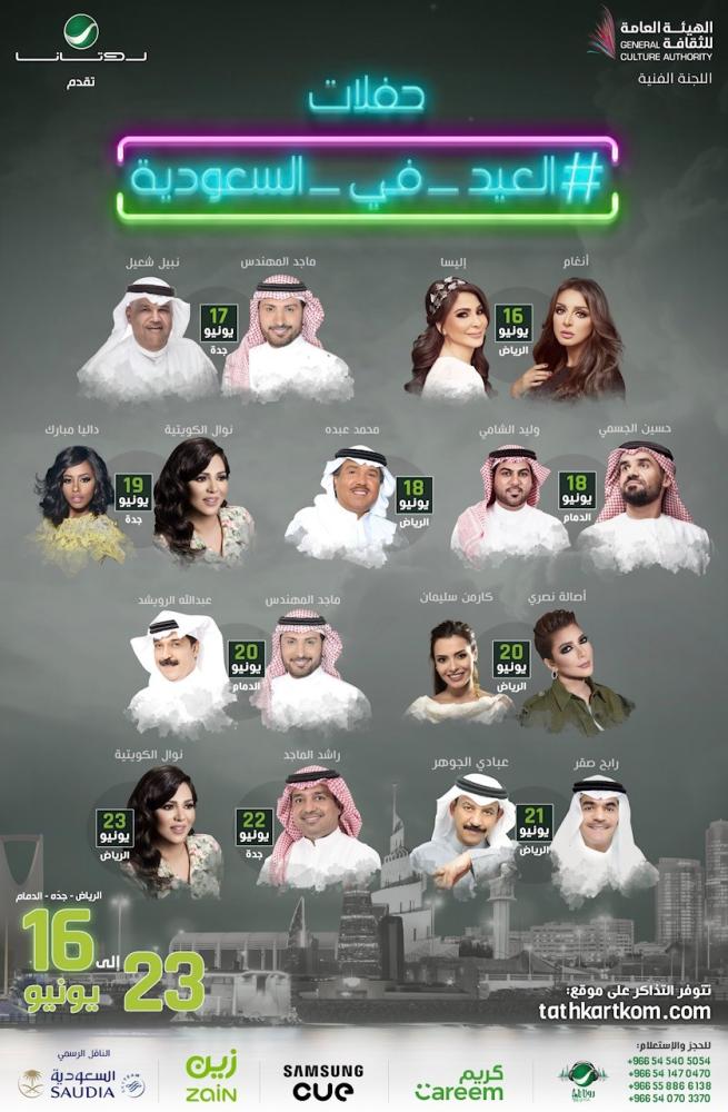 وتحيي أنغام وأليسا حفلا غنائيا في 16 يونيو بمركز الملك فهد الثقافي في الرياض، فيما يغني ماجد المهندس ونبيل شعيل بصالة الجوهرة بجدة يوم 17 يونيو، وحسين الجسمي ووليد الشامي بمركز معارض الظهران الدولي بالدمام في 18 يونيو، وفي اليوم ذاته يغني فنان العرب محمد عبده بمركز الملك فهد الثقافي بالرياض، كما تغني نوال الكويتية وداليا مبارك في صالة «الجوهرة» بجدة يوم 19 يونيو، وفي 20 يونيو يغني ماجد المهندس وعبدالله الرويشد، بمركز الظهران الدولي بالدمام. فيما تحيي أصالة نصري وكارمن سليمان ليلة 20 يونيو بمركز الملك فهد الثقافي بالرياض، تليها ليلة استثنائية لرابح صقر وعبادي الجوهر بنفس المركز، في حين يلتقي راشد الماجد الجمهور الجداوي في 22 يونيو بصالة الجوهرة، وتختتم نوال الكويتية الحفلات في 23 يونيو بمركز الملك فهد الثقافي بالرياض.