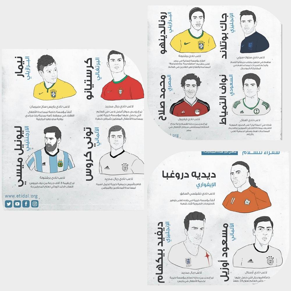 ومن أمثلة ذلك: لاعب نادي الهلال السعودي نواف التمياط، حيث شارك في حملة «ليان» على الحدود السورية للتعريف بمعاناة اللاجئين السوريين وتقديم المساعدات لهم، وهو سفير لجمعية تعنى بالأيتام، والمصري محمد صلاح لاعب نادي ليفربول الذي تبرع بجزء من دخله لقسم زراعة نخاع العظام لمستشفى سرطان الأطفال في مصر.