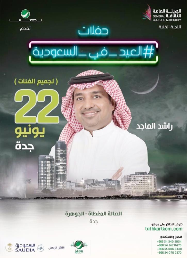 وتعد حفلة الماجد هي ثامن حفلات العيد والثاني بجدة الموجهة للعوائل، فيما أقيمت حفلة نسائية خاصة بالصالة المغلقة بملعب الجوهرة بجدة مساء الثلاثاء الماضي أحيتها نوال الكويتية، وداليا مبارك. كما شهدت جدة افتتاح «العيد في السعودية» بحفلة لنبيل شعيل وراشد الماجد ثالث أيام العيد.
