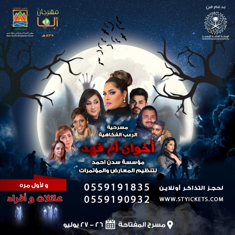 سيكون مسرح المفتاحة على موعد مع أول مسرحية كوميدية يقدمها فنانو وفنانات من نجوم الكوميديا الخليجية على حد سواء، وذلك يومي ٢٦ و٢٧ يوليو عبر العرض المسرحي «أخوان أم فهد»، الذي يقدم بدعم من الهيئة العامة للترفيه وضمن مهرجان أبها يجمعنا بحضور الجنسين، وهو من بطولة هيا الشعيبي وسعاد علي ونورة العميري، ومجموعة من الفنانين والفنانات الصاعدين من السعودية أتيحت لهم الفرصة للمشاركة في مثل هذه العروض.