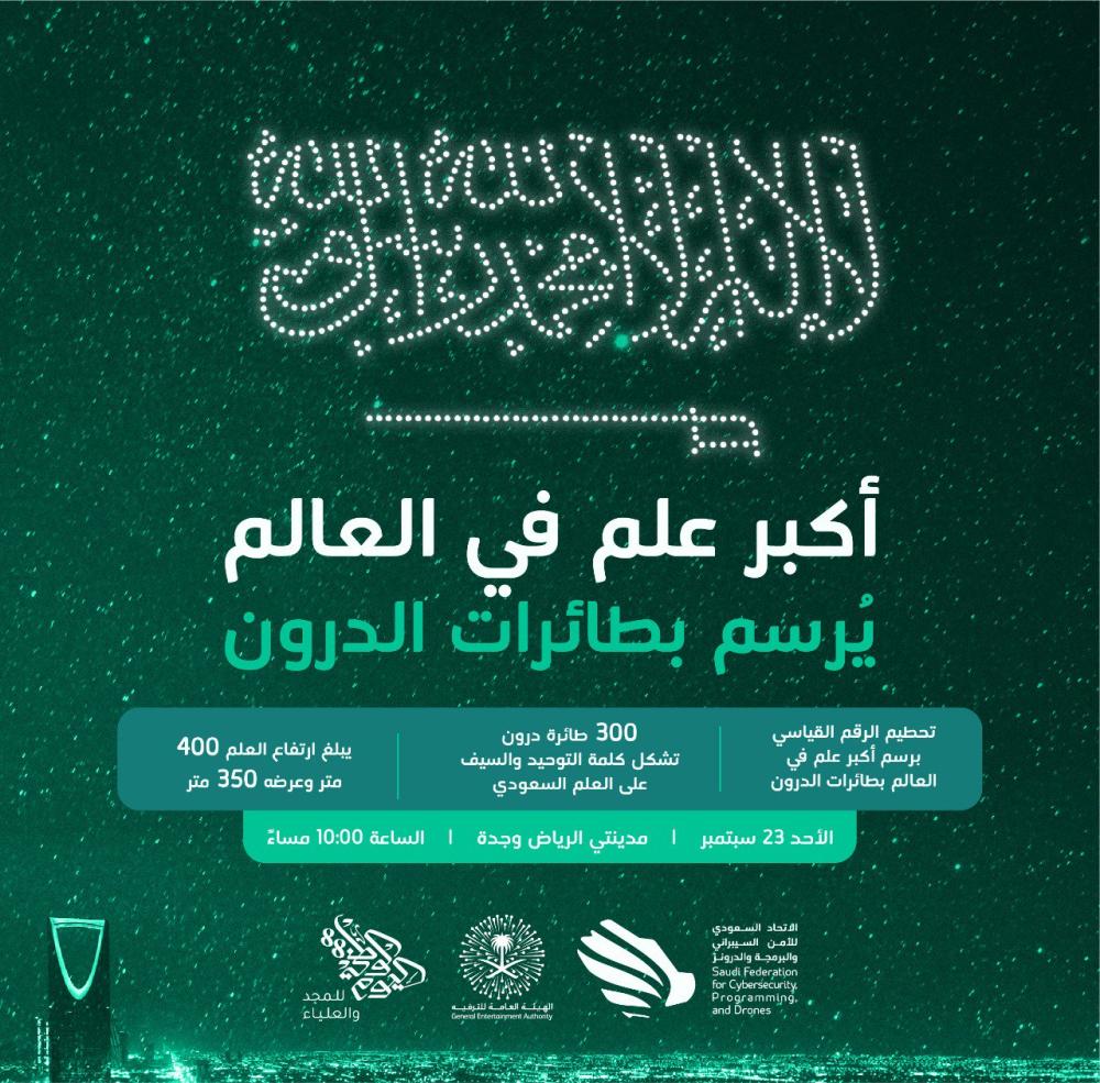 أوضح الاتحاد السعودي للأمن السيبراني والبرمجة والدرونز أنه وبالتعاون مع هيئة الترفيه سيعرض يوم الأحد 23 سبتمبر في مدينتي الرياض وجدة الساعة 10 مساءا أكبر علم في العالم يرسم بطائرات الدرون، مشيرا إلى أنه سيحقق رقم قياسي جديد يسجل باسم الوطن في اليوم الوطني 88 ضمن موسوعة غينس للأرقام القياسية لأكبر علم مشكل من طائرات الدرون.