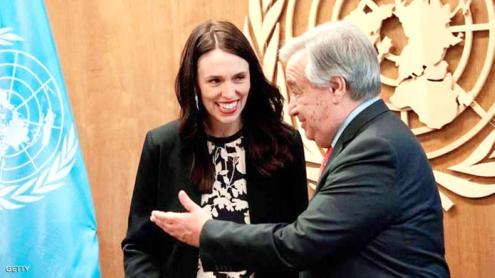 أرديرن مع الأمين العام داخل مبنى الأمم المتحدة.