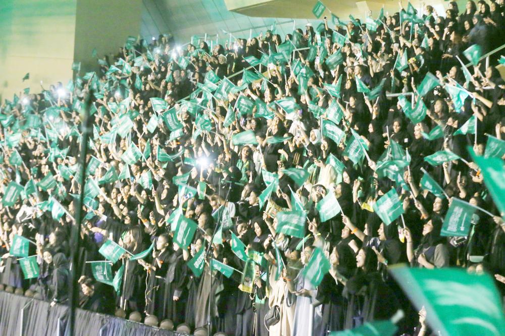 وبعد منتصف الليل صعد صقر الأغنية «رابح صقر» إلى المسرح وبحماس كبير، وعكس أسلوبه المعتاد في حفلات السابقة حين يختم فقراته بالأغنيات الوطنية، فبدأ هذه الحفلة، بسارعي للمجد والعليا، وبعدها توالت العديد من أغنياته الحماسية الوطنية والعاطفية منها: محمد روحنا فوق النجوم، أنت ملك، سقى الله والعديد من الأعمال الأخرى.