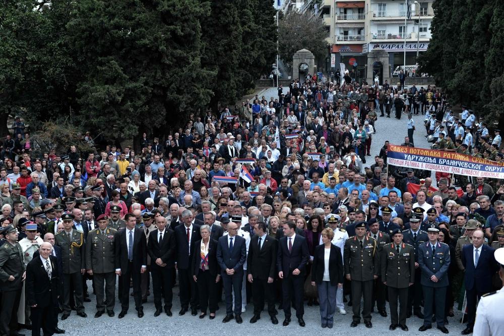 ووقف ممثلون عن الدول الأخرى الحليفة في جبهة الشرق بصمت في المقبرة التي دفنت فيها رفات أكثر من 20 ألف جندي فرنسي وصربي وإيطالي وبريطانيا وروسي.