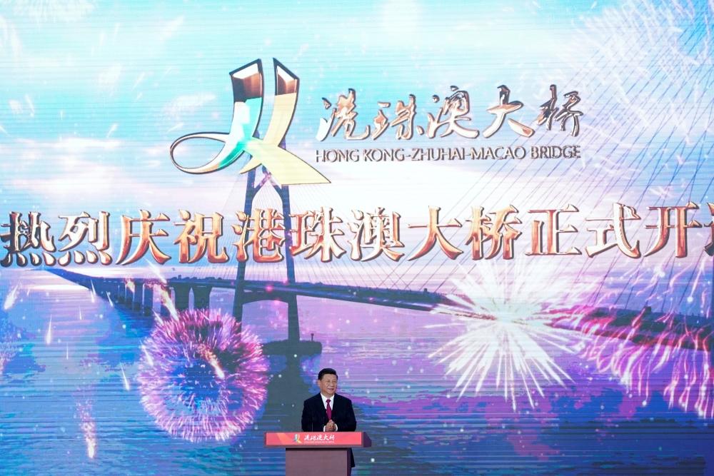 وقال الرئيس الصيني أمام شاشة ضخمة تنقل مشاهد للجسر يصاحبها عرض للألعاب النارية «أعلن افتتاح جسر هونغ كونغ-جوهاي-مكاو رسميًا».