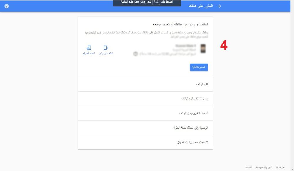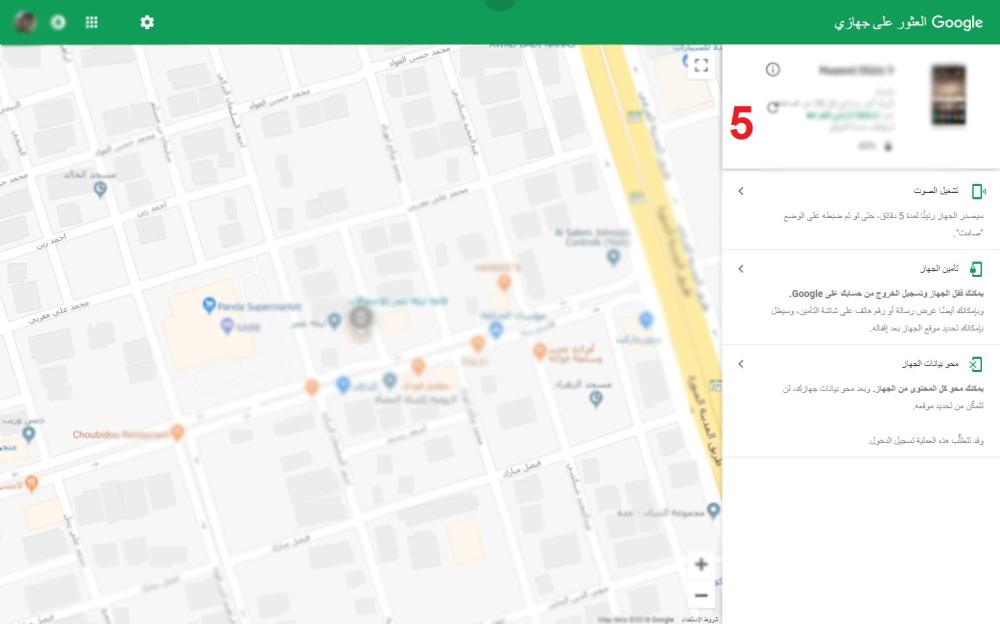 ستظهر بعدها الهواتف المرتبطة بحسابك إذا كانت أكثر من جهاز، بعد ذلك تختار الهاتف الذي تريد العثور عليه لتظهر بجانبه عدة خيارات منها إصدار نغمة رنين إذا كان الهاتف في نفس مكانك ولكنك لا تستطيع إيجاده، وخيار «إظهار على الخريطة» وخيار «تأمين الهاتف» وأخيراً خيار «مسح البيانات بالكامل من على الهاتف».