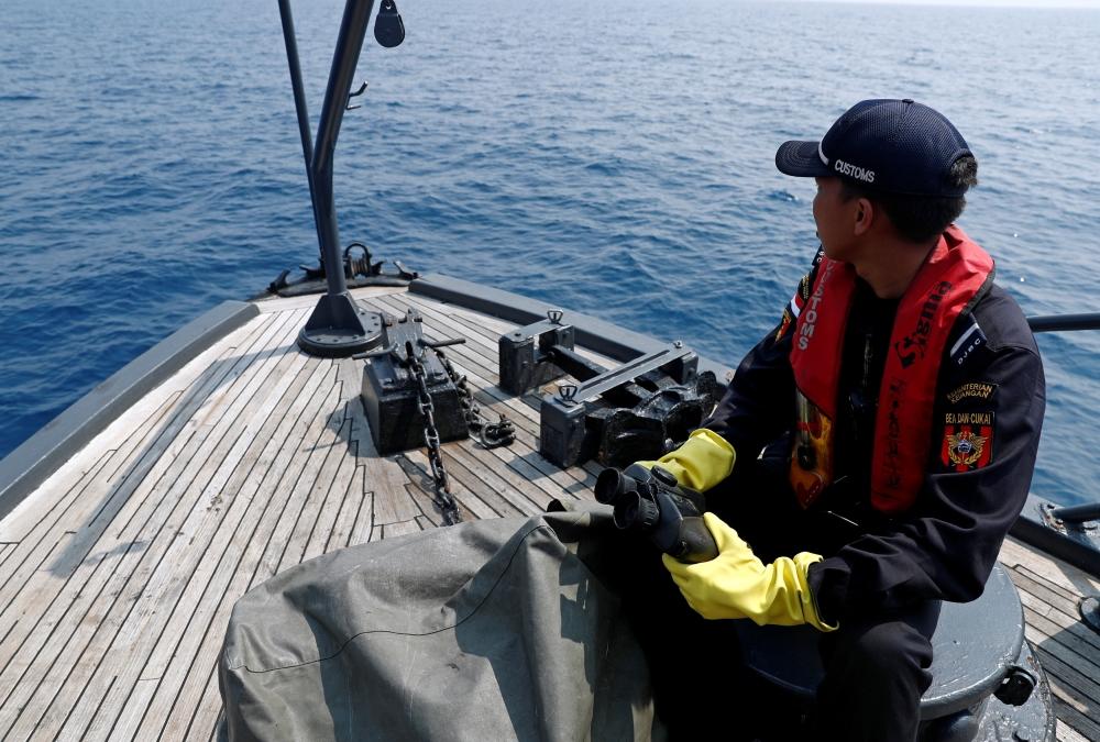 ضابط أمن إندونيسي يقوم بدوريات في منطقة بحث عن الصندوق الأسود.