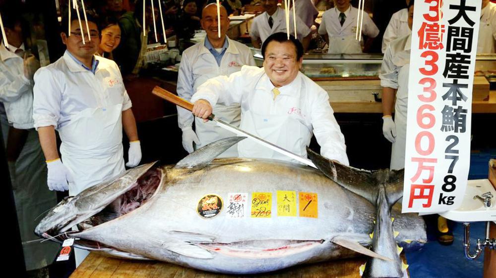 في أول مزاد علني في عام 2019، بيعت سمكة تونة بزعانف زرقاء وصفت بالأكبر في التاريخ، بنحو 3 ملايين دولار، فيما يصل وزنها إلى 278 كيلوغراما. ورسا المزاد على شركة كيومورا التي يدير مالكها كويشي كيمور سلسلة «سوشي زانماي»، وأظهرت هيئة الإذاعة والتلفزيون اليابانية «ان.اتش.كيه» كيومورا مبتهجاً قائلا: «فوجئت بارتفاع سعر التونة هذا العام، لكن السمكة هي الأفضل». وتباع التونة عادة بنحو 90 دولارا للكيلوغرام، لكن السعر يرتفع إلى ما يزيد على 400 دولار قرب نهاية العام، خصوصا الصيد الثمين القادم من أوما شمال اليابان. يذكر أن اليابانيين أكبر مستهلكي سمك التونة ذات الزعانف، وأدى ارتفاع استهلاكه إلى الإفراط في صيد هذه الأنواع، رغم تحذير الخبراء من خطر انقراضها المحتمل، لاسيما أن هذا النوع انخفض في المحيط الهادئ بنسبة 96% عن مستويات ما قبل الصناعة.