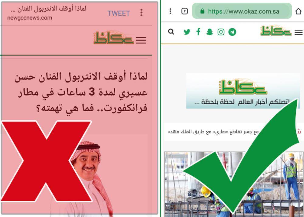 لا تزال جهات مجهولة تحاول النيل من صحيفة «عكاظ»، ببث أخبار مفبركة وعارية من الصحة عبر روابط خبيثة تنتحل اسم وشعار «عكاظ»، وتستنسخ واجهة موقعها الإلكتروني، في محاولةٍ للإساءة لسمعة الصحيفة، وإثارة البلبلة من خلال هذه الأخبار، وكان آخرها خبر تداوله مغردون، بعنوان «إيقاف الفنان السعودي حسن عسيري في مطار فرانكفورت».