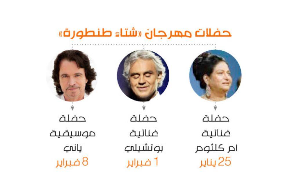 وينتظر أن يشهد المهرجان 3 حفلات متنوعة بين غنائية وموسيقية خلال الفترة القادمة، لكل من كوكب الشرق أم كلثوم، والعالميين أندريا بوتشيلي، وياني كريسماليس.