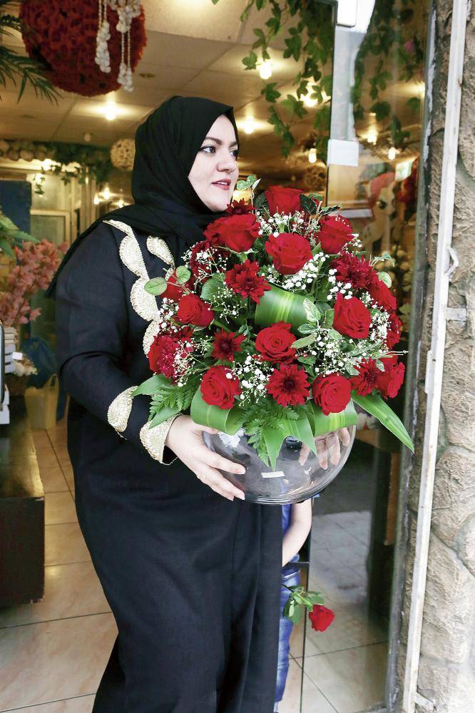 سيدة تحمل باقة ورد في أحد محلات الورود في محافظة جدة، التي شهدت إقبالا كبيرا أمس بمناسبة الاحتفال بيوم الفالنتاين. (تصوير: مديني عسيري)