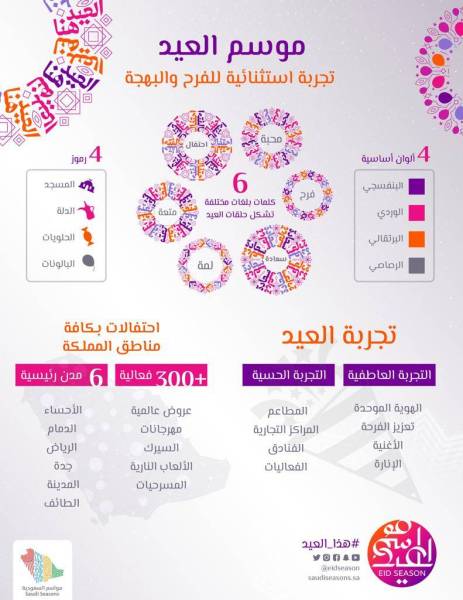 وضم برنامج «موسم العيد» جملة من الأنشطة والفعاليات التي تسعى لتلبية مختلف شرائح المجتمع في مناطق المملكة كافة، مع التركيز على 6 مدن رئيسية هي: «الرياض، جدة، المدينة المنورة، المنطقة الشرقية، الأحساء، الطائف»، وذلك عبر 3 محاور رئيسية، هي: «اللمة والمحبة، السعادة والبهجة، المتعة والاحتفال».