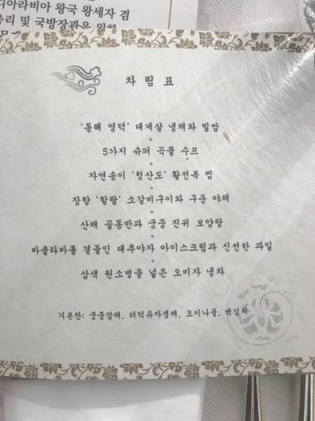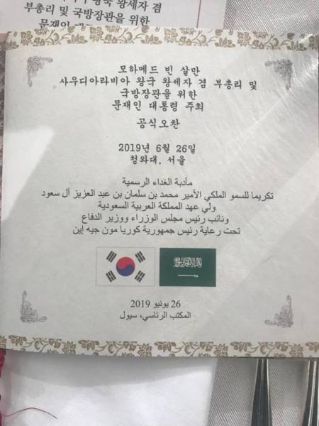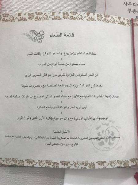 وكُتبت قائمة الطعام باللغتين العربية والكورية تقديراً من الجانب الكوري لضيوفهم السعوديين.