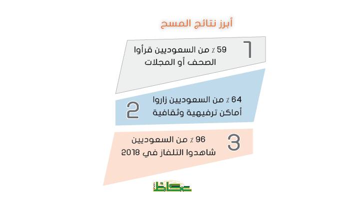 كشفت الهيئة العامة للإحصاء أن 35.36% من سكان المملكة تتوفر لديهم مكتبة منزلية، وبلغت نسبة قراءة الكتب لدى السعوديين (15 سنة فأكثر) (58.18%)، في حين بلغت نسبة الأفراد (15 سنة فأكثر) الذين قرأوا الصحف أو المجلات (53.96%) من إجمالي سكان المملكة، وبلغت نسبة الأفراد السعوديين (15 سنة فأكثر) الذين قرؤوا الصحف أو المجلات (59.46%) خلال الـ (12) شهراً منهم (67.14%) ذكور، بينما كانت نسبة الإناث السعوديات اللاتي قرأن الصحف أو المجلات (51.48%). فيما بلغت نسبة قراءة الصحف أو المجلات الإلكترونية (66.58%) من إجمالي قرَّاء الصحف أو المجلات، فيما بلغت نسبة قرَّاء الصحف أو المجلات الورقيَّة (5.77%)، أما نسبة قرَّاء الصحف أو المجلات الإلكترونيَّة والورقية معًا فقد بلغت (27.65%).