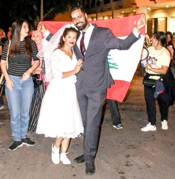 فاجأت اللبنانية ملاك علوية صاحبة الركلة الشهيرة، المحتجين وسط ساحة رياض الصلح في بيروت، بفستانها الأبيض بجانب عريسها محمد، يعلنان زواجهما. وعرفت ملاك إعلامياً بـ«صاحبة الرفسة الشهيرة» بعد توجيه ركلة بطريقة الكاراتيه لأحد مرافقي الوزير أكرم شهيب، بعد إطلاقه النار في الهواء (الخميس) الماضي، ضد محتجين قطعوا عليه الطريق في العاصمة اللبنانية التي تشهد احتجاجات واسعة منذ 17 أكتوبر الجاري، تنديدا بسوء الأوضاع المعيشية. وانتشرت لقطة الركلة مع تعليقات «نحنا الشعب.. الخط الأحمر». بينما اعتذر الوزير لاحقاً، موضحاً أن اعتراض الشباب لسيارته كان وراء الواقعة.