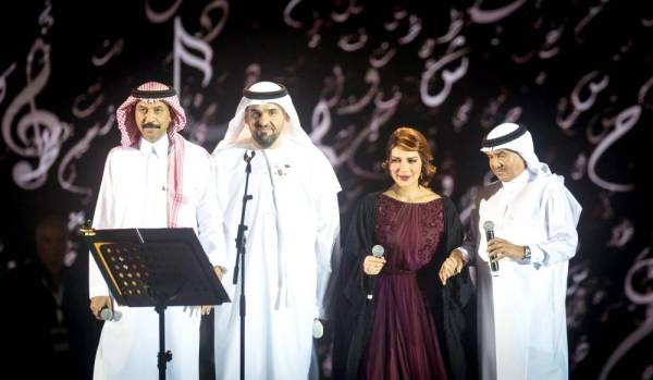 وأحيا ليلة عبدالرحمن بن مساعد 4 نجوم كبار بروائعهم الغنائية، فنان العرب محمد عبده، وعبادي الجوهر، وأصالة، وحسين الجسمي، وختموا جميعا بمقطع وطني من ملحمة «كتاب مجد بلادنا»، إذ استهلت أصالة أولى الوصلات الغنائية بباقة من أجمل ما غنت من كلمات عبدالرحمن بن مساعد مثل: «النظرة الخجولة»، و«رحل»، و«يسعد صباحك»، و«ما أظن». تلاها عبادي الجوهر الذي جمعه مع الأمير عبدالرحمن مشوار حافل، إذ بدأ بـ«تدرين وأدري بنفترق»، أعقبها بـ«أجهلك»، و«عيونك آخر آمالي»، و«الصبر»، و«قالوا ترى». فيما أشعل حسين الجسمي حماس الجماهير بأغنية «سلمان الشهامة»، ثم «اصعد بعزمك»، و«نصف الفراق»، و«أربعين»، والعمل الجديد «أبكي أغاني». وختم فنان العرب محمد عبده الذي وصفه الأمير عبدالرحمن سابقا بأنه فنان يليق بعظمة بلاده، وبدأ وصلته بـ«مساء الخير»، ثم مزج أبونورة 3 أغنيات دون توقف «البرواز، وما هو عادي، ومذهلة»، وختم وصلته بـ«شبيه الريح».