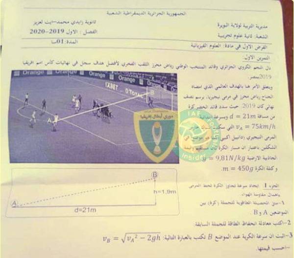 فوجئ طلاب مدرسة ثانوية بولاية البويرة، جنوبي الجزائر، بصورة نجم كرة القدم رياض محرز في اختبار الفيزياء، فيما كان هدفه في شباك منتخب نيجيريا محور الاختبار. وفي ورقة الأسئلة، التي تناقلتها وسائل إعلام جزائرية وعدد من المنصات، تمحور أغلب الأسئلة على على هدف الوقت بدل الضائع من نصف نهائي بطولة أفريقيا التي أقيمت في مصر أخيرا، وتوج بها «محاربو الصحراء». ومنح الممتحن الطلبة بعض المعطيات بشأن الركلة الحرة من على حدود منطقة الجزاء، قبل أن يطلب منهم إيجاد استنتاجات؛ منها سرعة الكرة، وطاقتها، وقوة احتكاكها بالهواء، وغيرها. وفتح الهدف الذي سجله لاعب مانشستر سيتي الإنجليزي الباب أمام منتخب الجزائر لبلوغ نهائي البطولة، قبل أن يحسم محرز وزملاؤه اللقب الثاني في تاريخ بلاده. ويعتبر محرز (28 عاماً) هدفه في نيجيريا «الأفضل في مشواره الكروي».