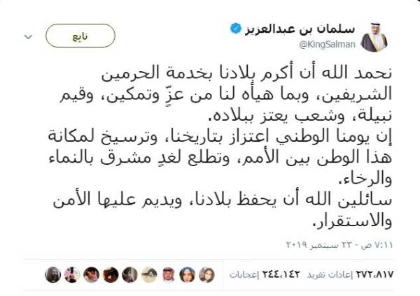 وتصدرت تغريدات خادم الحرمين الشريفين الملك سلمان بن عبدالعزيز أكثر خمس تغريدات تفاعلاً في المملكة، والتي تناولت حلول شهر رمضان وعيد الفطر واليوم الوطني ومجزرة نيوزيلندا وبداية السنة الهجرية.