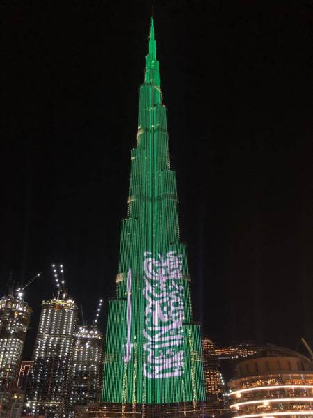 تزين برج خليفة في دبي بالعلم السعودي، اليوم الأربعاء، احتفالا بزيارة ولي العهد نائب رئيس مجلس الوزراء وزير الدفاع الأمير محمد بن سلمان بن عبدالعزيز إلى الإمارات.