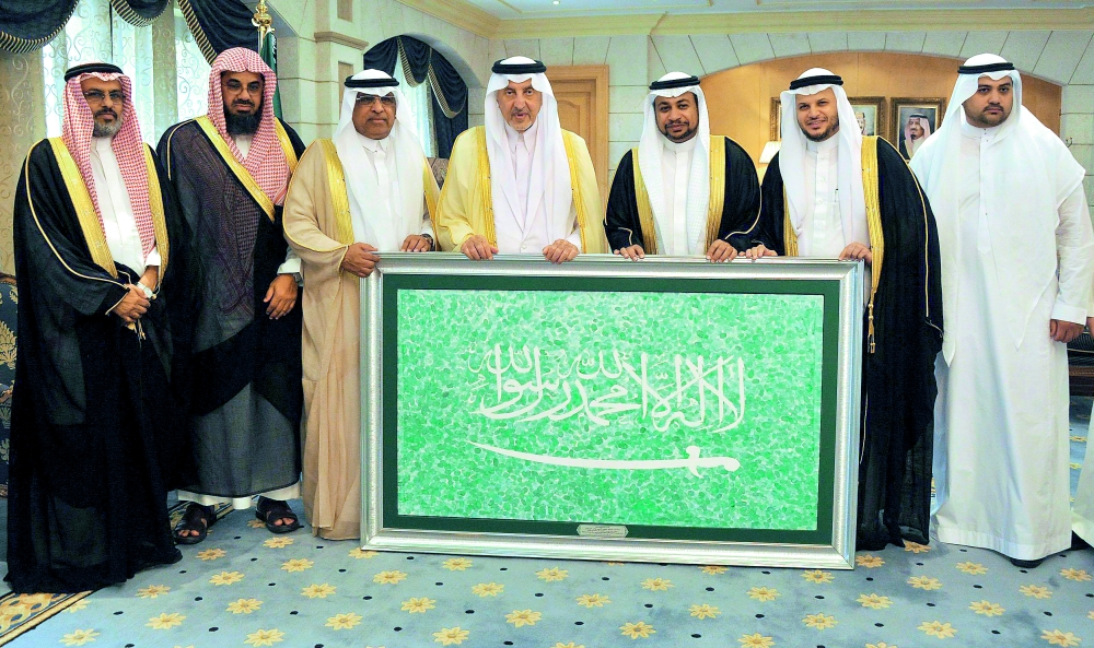 الأمير خالد الفيصل متسلما لوحة الخفاق الأخضر التي بصم عليها 10 آلاف طالب وطالبة. (واس)