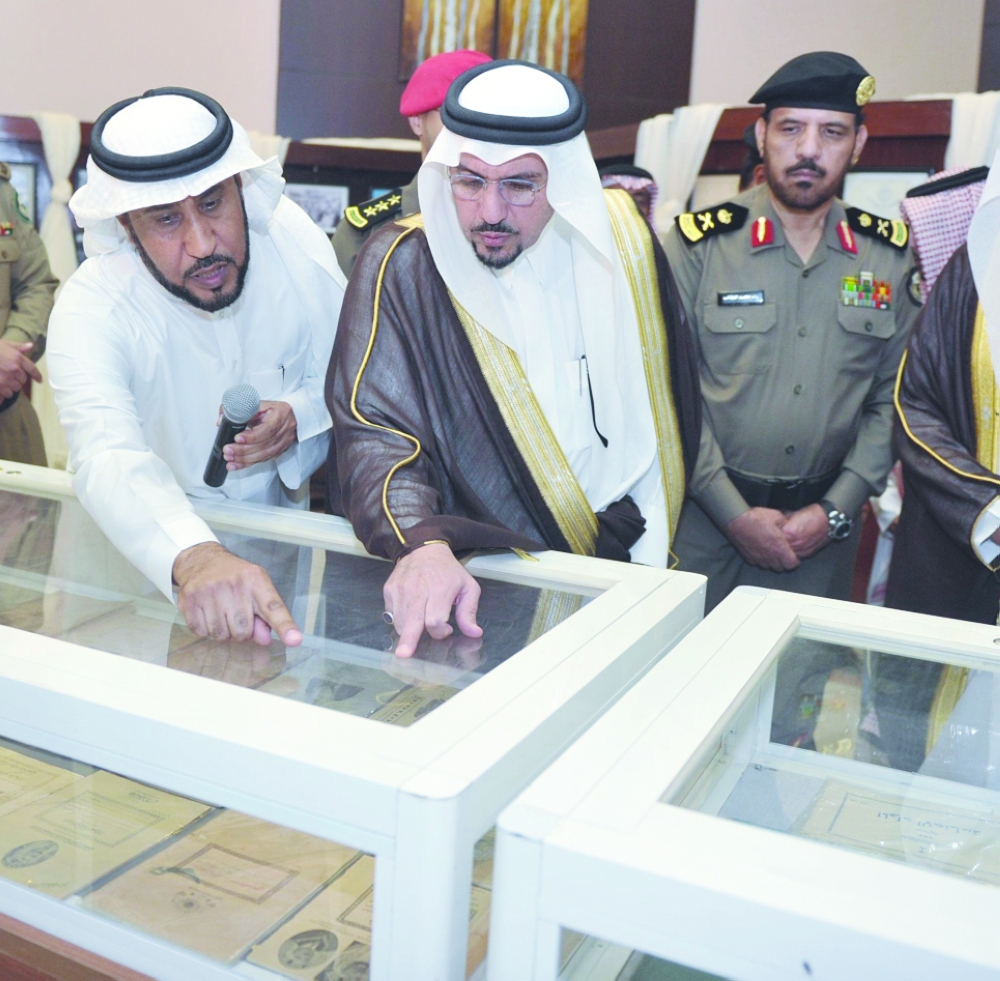 أمير القصيم متجولا في المعرض التاريخي للمدرسة. (عكاظ)