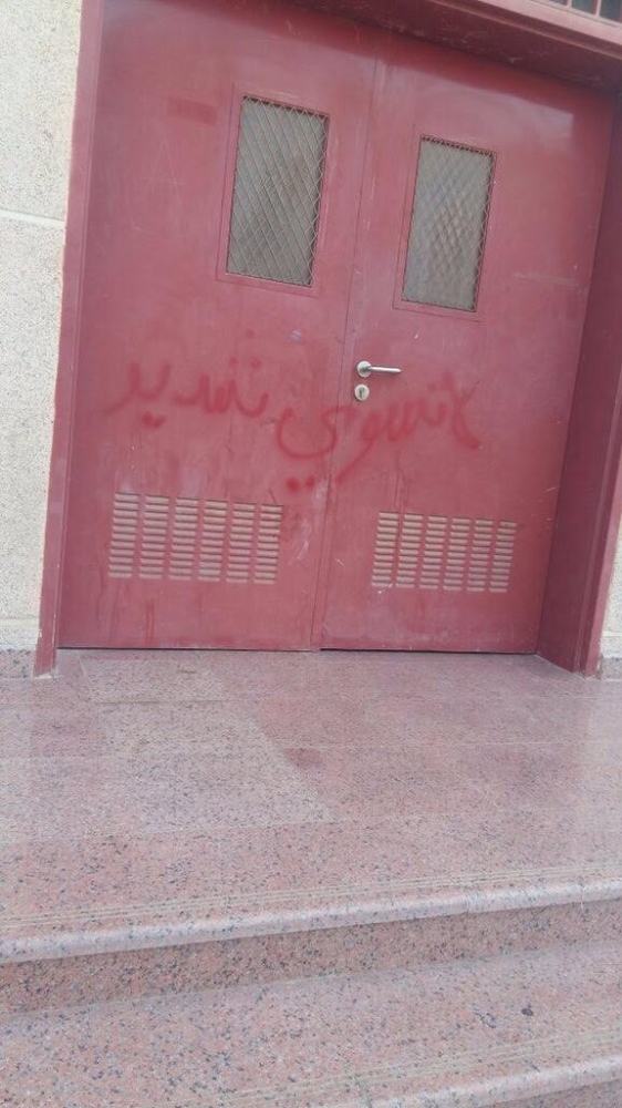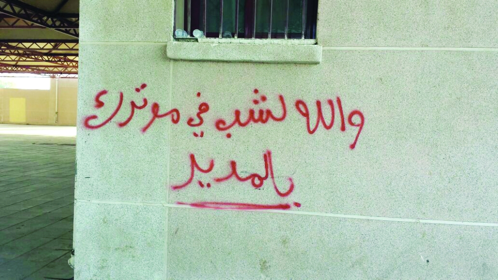 بعد أقل من يوم واحد على إحراق متعمد لسيارة قائد مدرسة ثانوية نمرة في جدة.. وجّه مجهولون، يعتقد أنهم طلاب، تهديدات جادة إلى قائد مدرسة ابن النفيس الثانوية في بحرة المجاهدين ألمحوا فيها إلى إشعال سيارته بكتابة عبارات في جدران المدرسة تحضه على الرحيل «سوف ترحل عما قريب» «والله لشب في موترك يا مدير»!