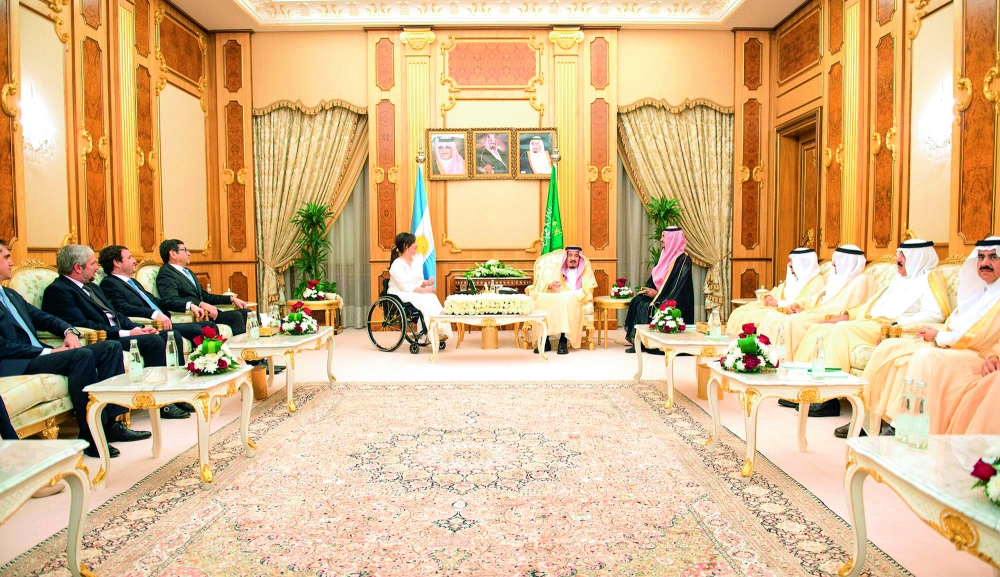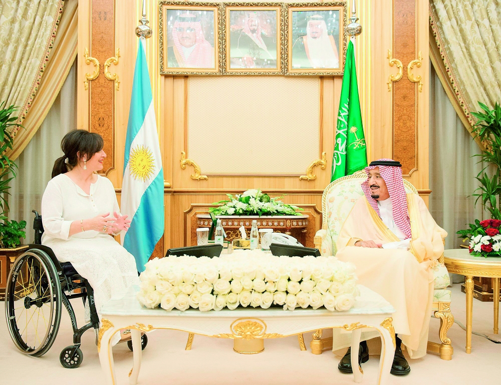 جاء ذلك في جلسة مباحثات مشتركة لدى استقبال خادم الحرمين الشريفين في مكتبه بقصر اليمامة أمس (الأحد) نائبة رئيس جمهورية الأرجنتين والوفد المرافق لها، حيث رحب بها، متمنيا لها طيب الإقامة في المملكة، فيما أعربت غابرييلا ميكيتي عن شكرها للملك سلمان بن عبدالعزيز على ما وجدته من حفاوة استقبال وكرم ضيافة.
