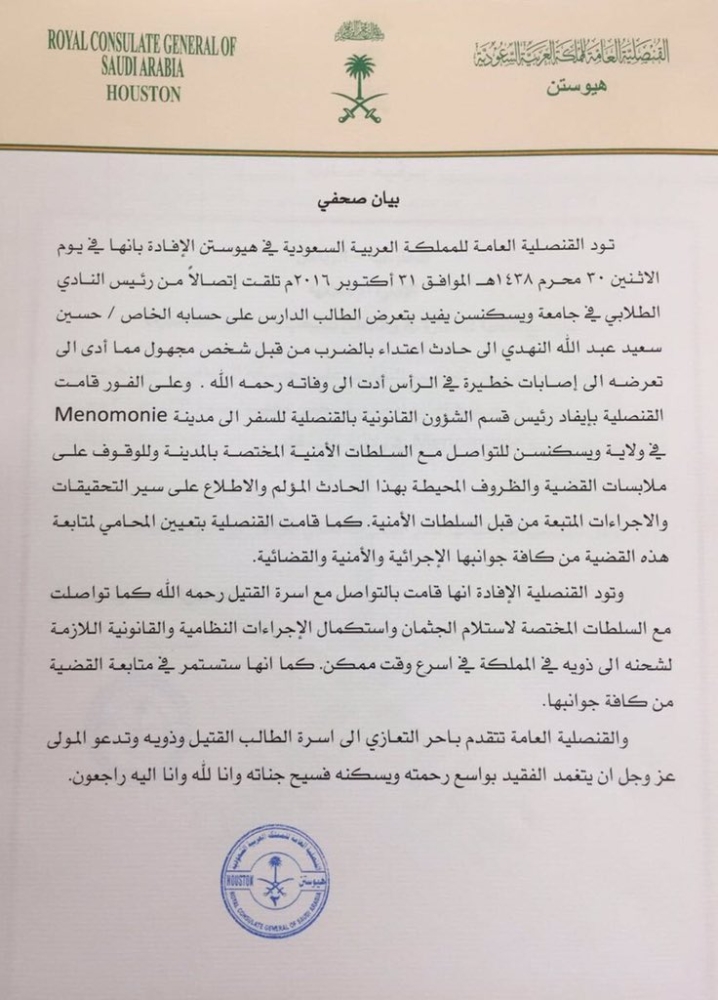 وقالت في البيان: "تود القنصلية العامة للمملكة العربية السعودية في هيوستن الإفادة بأنها في يوم الاثنين 30 محرم 1438هـ الموافق 31 أكتوبر 2016م تلقت إتصالا من رئيس النادي الطلابي في جامعة ويسكنسن يفيد بتعرض الطلاب الدارس على حسابه الخاص حسين سعيد عبدالله النهدي إلى حادث اعتداء بالضرب من قبل شخص مجهول مما أدى إلى تعرضه إلى إصابات خطيرة في الرأس أدت إلى وفاته رحمه الله. وعلى الفور قامت القنصلية بإيفاد رئيس قسم الشؤون القانونية بالقنصلية للسفر إلى مدينة (Menomonie) في ولاية ويسكنسن للتواصل مع السلطات الأمنية المختصة بالمدينة وللوقوف على ملابسات القضية والظروف المحيطة بهذا الحادث المؤلم والاطلاع على سير التحقيقات والاجراءات المتبعة من قبل السلطات الأمنية. كما قامت القنصلية بتعيين المحامي لمتابعة هذه القضية من كافة جوانبها الإجرائية والأمنية والقضائية.