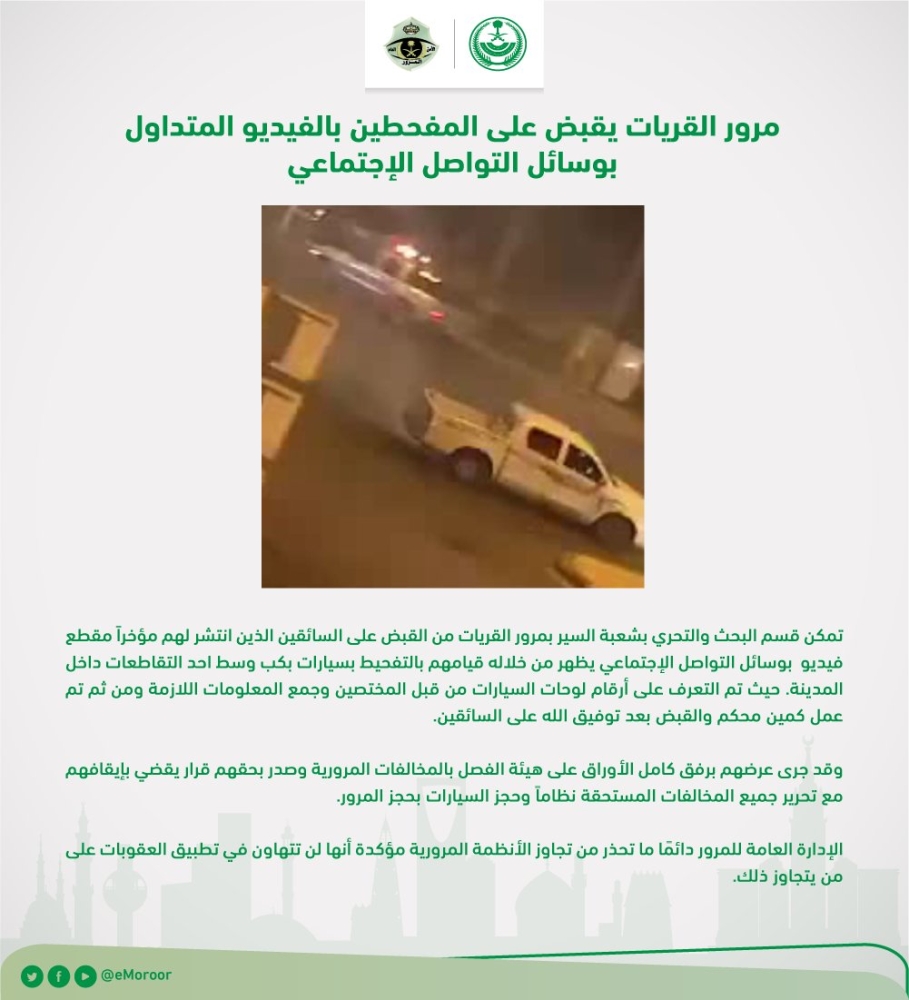مرور القريات يطيح بمفحطين ظهروا في مقطع فيديو