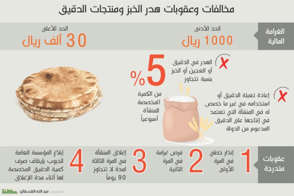 وتضمنت المجموعة السادسة من جدول الغرامات والجزاءات الملحق بلائحة الغرامات والجزاءات عن المخالفات البلدية أنه في حال ثبت لمراقبي وزارة الشؤون البلدية والقروية أو وزارة التجارة والاستثمار قيام المنشأة التي تستخدم الدقيق بأي من مخالفات الهدر في الدقيق أو العجين أو الخبز بنسبة تتجاوز 5% من الكمية المخصصة لها أسبوعياً، أو إعادة تعبئة الدقيق أو استخدامه في غير ما خصص له في المنشأة التي تعتمد في إنتاجها على الدقيق المدعوم من الدولة، تطبق عليها غرامة مالية تتراوح بين 1000 - 30 ألف ريال، على أن تتدرج العقوبة بدءاً من الإنذار في المرة الأولى، ثم فرض غرامة في المرة الثانية بحسب حجم المنشأة ونوع المخالفة، وفي المرة الثالثة يتم إغلاق المنشأة لمدة لا تتجاوز 90 يوماً، وتبلغ المؤسسة العامة للحبوب بإيقاف صرف كمية الدقيق المخصصة لها أثناء مدة الإغلاق.