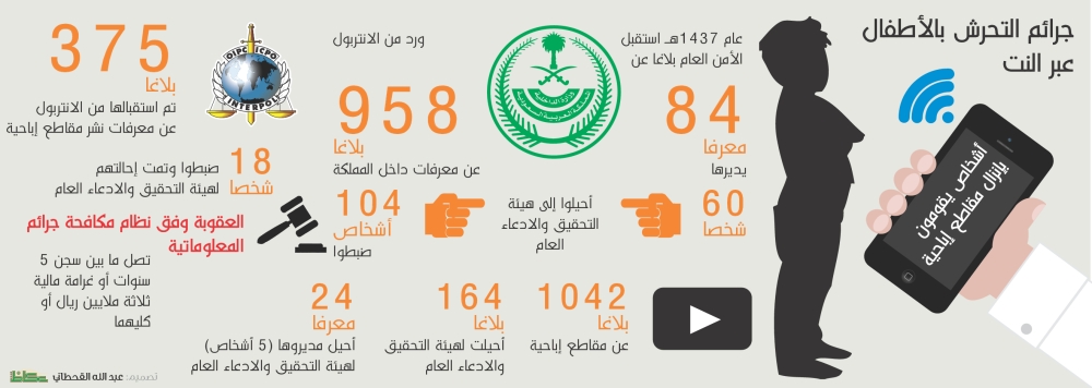 وأعلن الغامدي إحصاءات عمل الأمن العام في مكافحة الاستغلال الجنسي للأطفال عبر الإنترنت، إذ استقبل الأمن العام في عام 1436 (294) بلاغا لمعرفات ممارسة لنشر مقاطع إباحية، ضبط منها 98 شخصا وتمت إحالتهم لهيئة التحقيق والادعاء العام، فيما تم استقبال 314 بلاغا من الإنتربول من معرفات تنشط داخل المملكة أحلنا منها 29 شخصا لهيئة التحقيق والادعاء العام، ليكون إجمالي ذلك 608 معرفات وتمت إحالة 127 شخصا لهيئة التحقيق والادعاء العام لاستكمال الإجراءات النظامية.