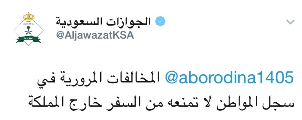 أكدت المديرية العامة للجوازات، عبر حسابها الرسمي في "تويتر"، أن المخالفات المرورية لا تمنع المواطن من السفر خارج المملكة.
