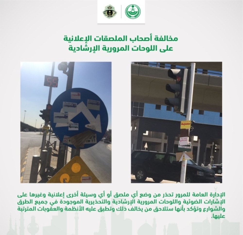 وأوضحت الإدارة على حسابها في "تويتر"، أنه يمنع وضع أي ملصق أو أي وسيلة إعلانية أخرى، على الإشارات الضوئية واللوحات المرورية الإرشادية والتحذيرية الموجودة في جميع الطرق والشوارع في المملكة.